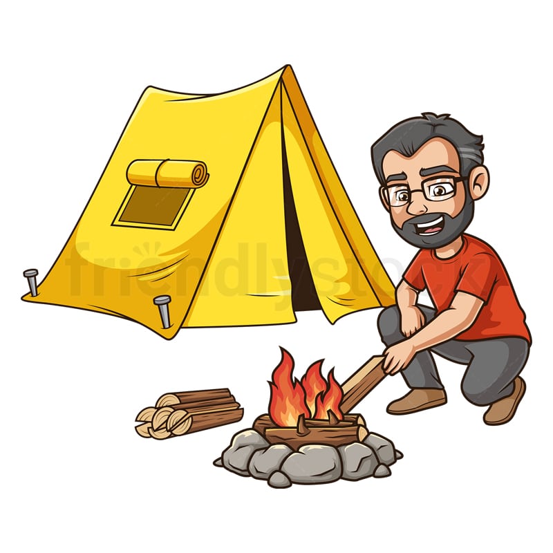 Royalty-free stock illustration of a middle-aged man with glasses on a camping trip, next to a bonfire, with a tent behind him.
