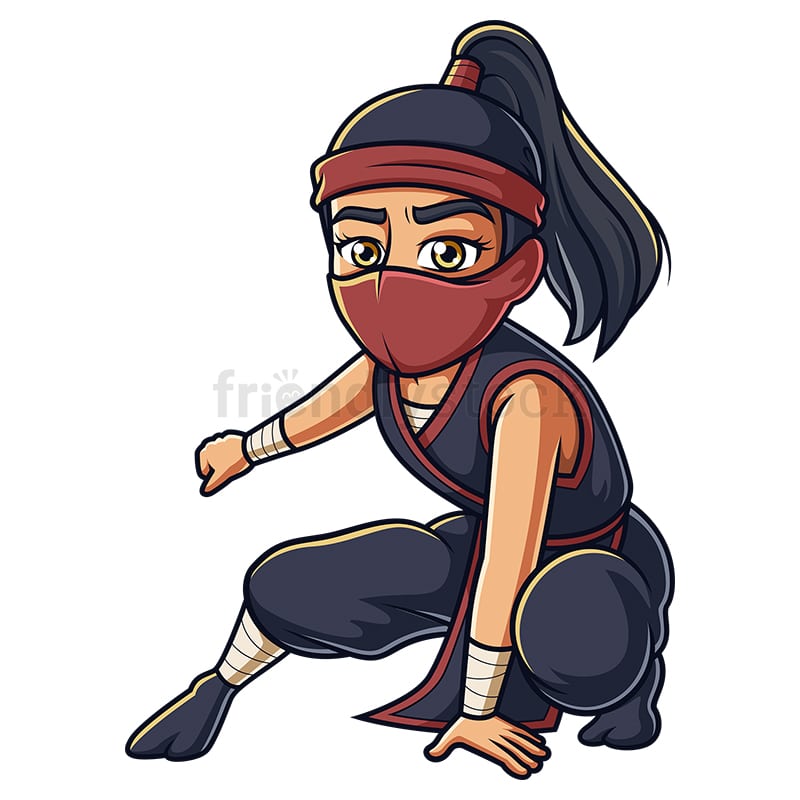 Royalty-free stock illustration of a female ninja wearing a black uniform and red mask, sitting on the ground in concentration, preparing to launch an attack.