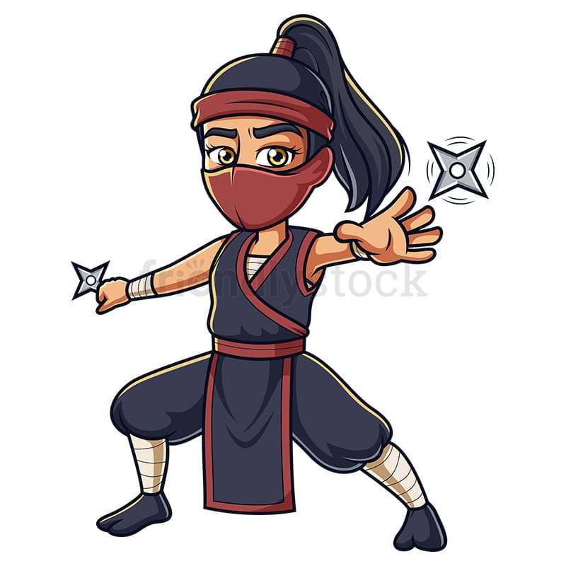 Royalty-free stock illustration of a woman wearing a black uniform and red mask, looking serious as she throws ninja stars.