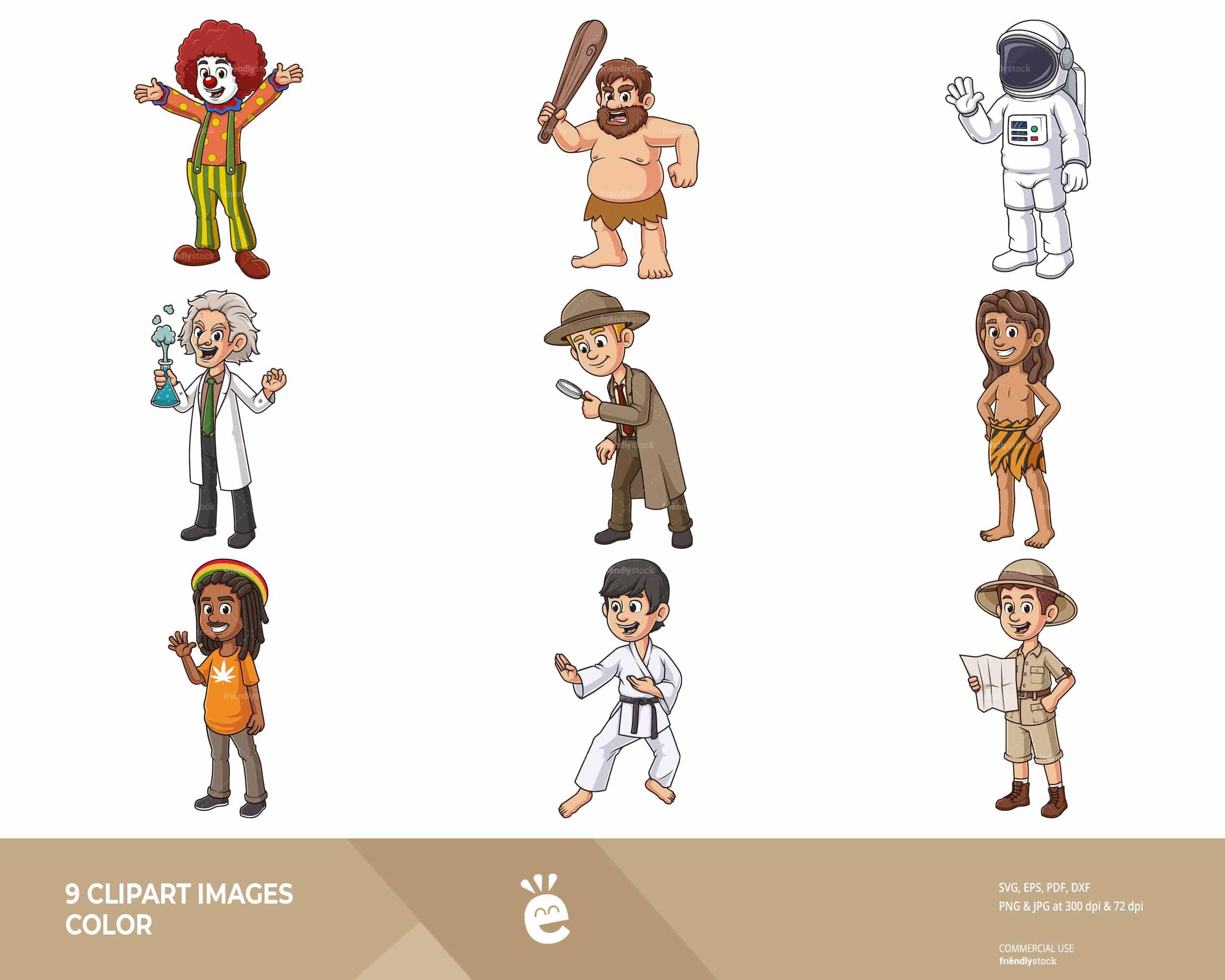 A collection of nine high-quality vector illustrations of various people. The bundle includes the following cartoon clipart: