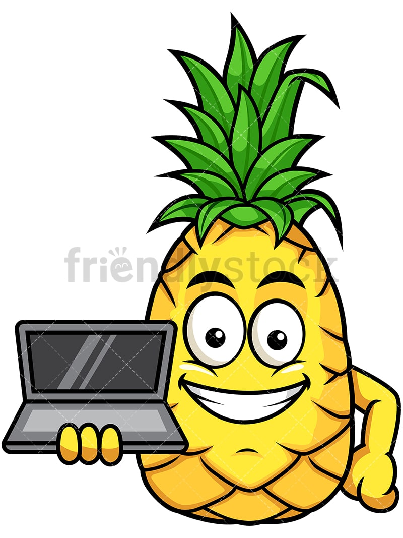 Royalty-free stock illustration of a pineapple cartoon character showing off a laptop and smiling.