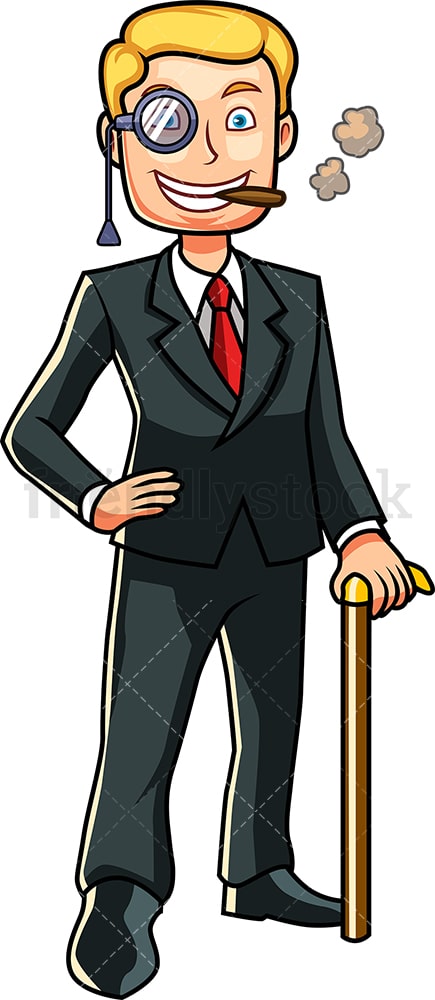 This blond male is the epitome of wealth. He sports a monocle over his right eye and held tightly in his grinning mouth is a fat cigar. He wears a large, black top hat that pairs well with his dark suit, white shirt, and red tie. His right hand is on his hip, his left hand holding a walking stick. He stands before a long, blue limousine.