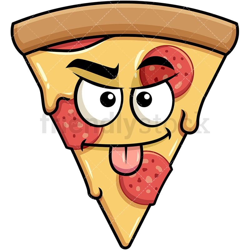 Royalty-free stock illustration of a pizza emoji with pepperoni and cheese topping, sticking its tongue out while wearing a sarcastic look on its face.