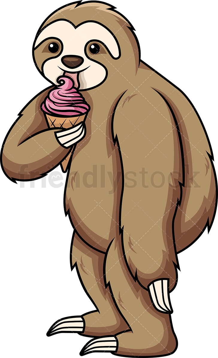 Royalty-free stock illustration of a sloth holding an ice cream cone and licking it, looking happy.