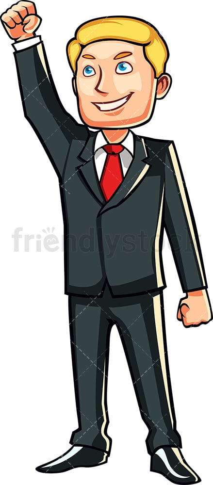 This man’s figure is one of exultation and success. He is depicted in a triumphant stance with his right arm raised in a fist over his head while his left arm is in the same pose but held down from his body. He has blonde hair and is wearing a dark suit, white shirt and red tie. He has a pleased look on his face and his eyes are looking skyward.