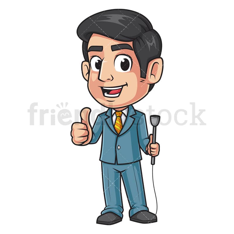 Royalty-free stock illustration of a television host, holding a microphone wioth one hand, and making a thumbs up gesture with the other.