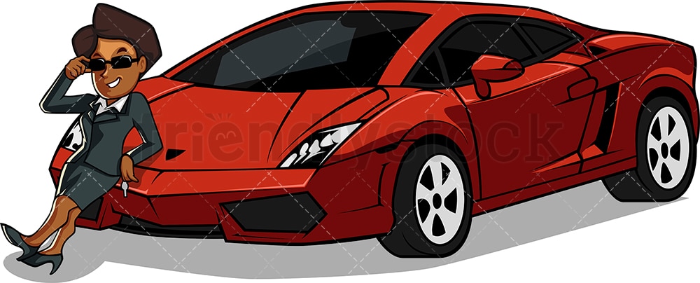 Royalty-free stock vector illustration of a rich and successful black business woman showing off her sports car.