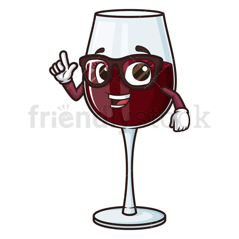 Royalty-free stock illustration of a wine mascot character smiling as it points up, wearing glasses.