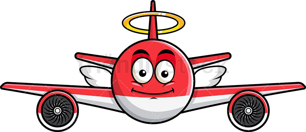 Royalty-free stock illustration of a red, single engine airplane emoji, with wings and a halo floating above its head, looking like an angel.