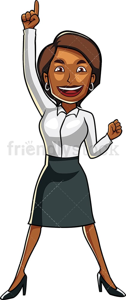Yes, #1! The pose the black businesswoman is holding is certainly one of a winner and someone who is very happy about her situation. She has a huge smile on her face, even her eyes are sparkling with excitement. Her right arm is raised straight up with her pointer finger aimed at the sky. Her left arm is pulled into her body making the downward fist gesture of “YES”. She is wearing a dark-green skirt and a formal shirt.