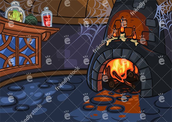Royalty-free stock illustration of a creepy witch lair with a lit fireplace and candles, and some spider webs.