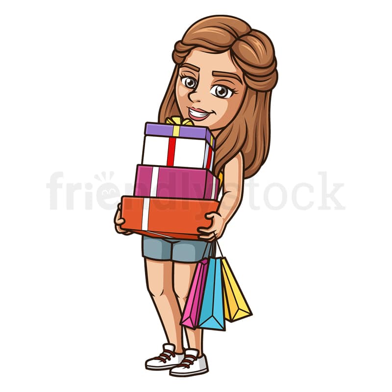 Royalty-free stock illustration of a young woman with brown hair carrying a huge stack of holiday gifts and shopping bags.