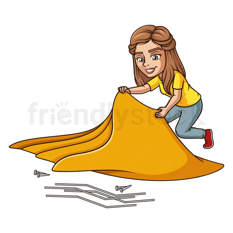 Royalty-free stock illustration of a young woman with brown hair getting ready to set up a tent while on a camping trip.