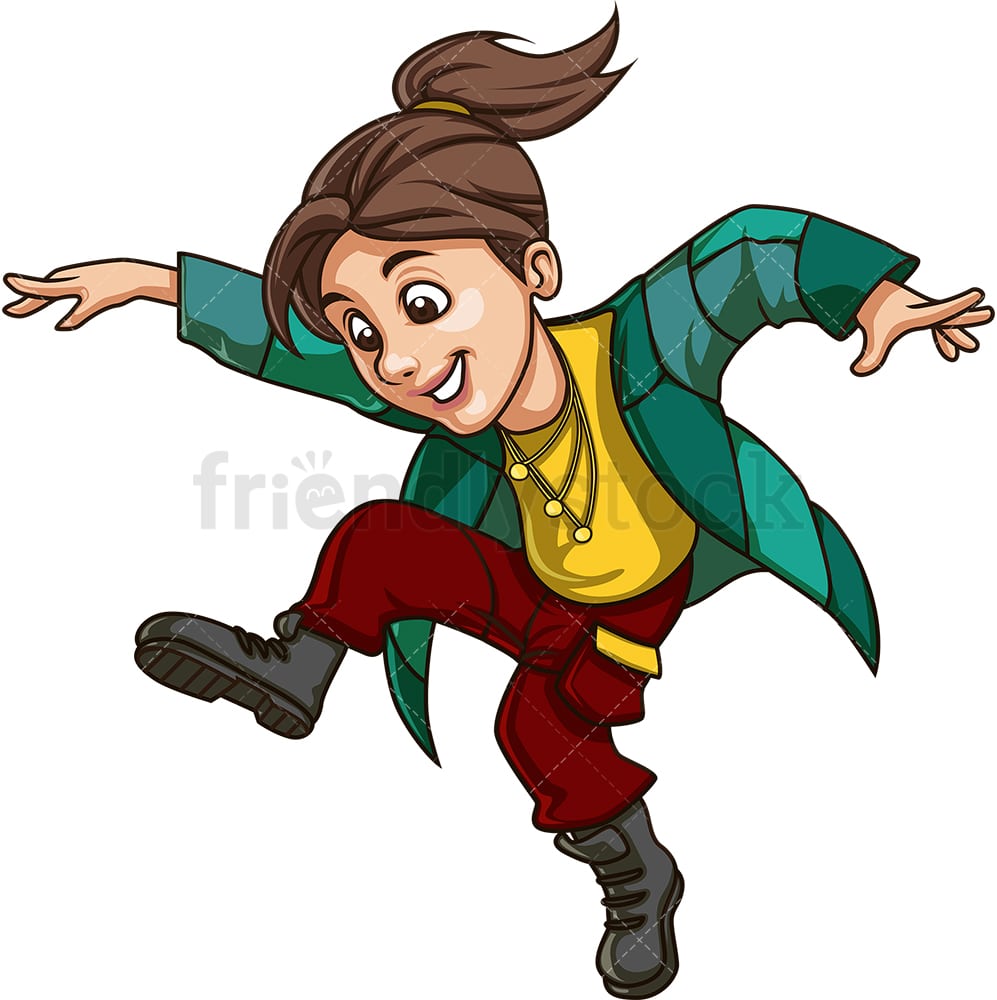 Royalty-free stock illustration of a young and energetic woman performing a jump while wearing a big smile on her face.